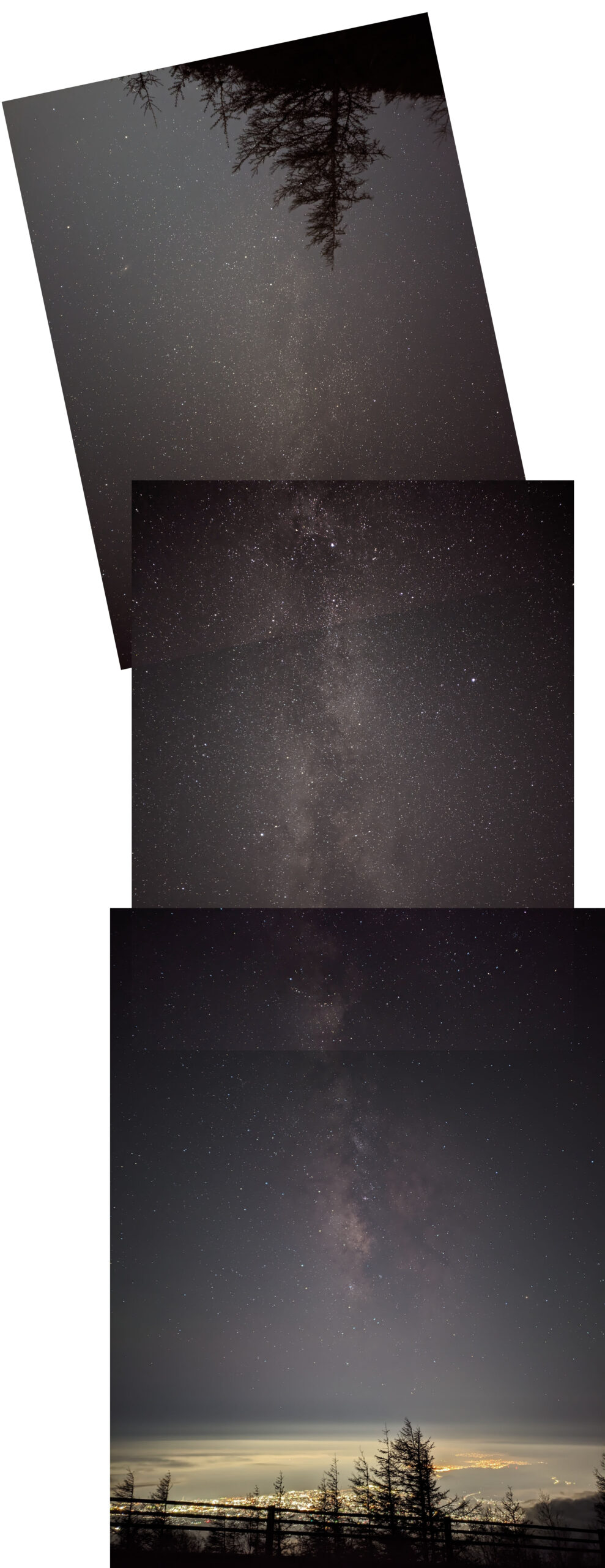 最近はここで様子見してから出掛けてる。読み通り5月31日の晩は、御殿場市街地の明かりが雲海で消されてたので、前回よりも好条件だった(^^) そして今回は、南から北北東に流れる天の川を繋ぎ合わせてみた。。。