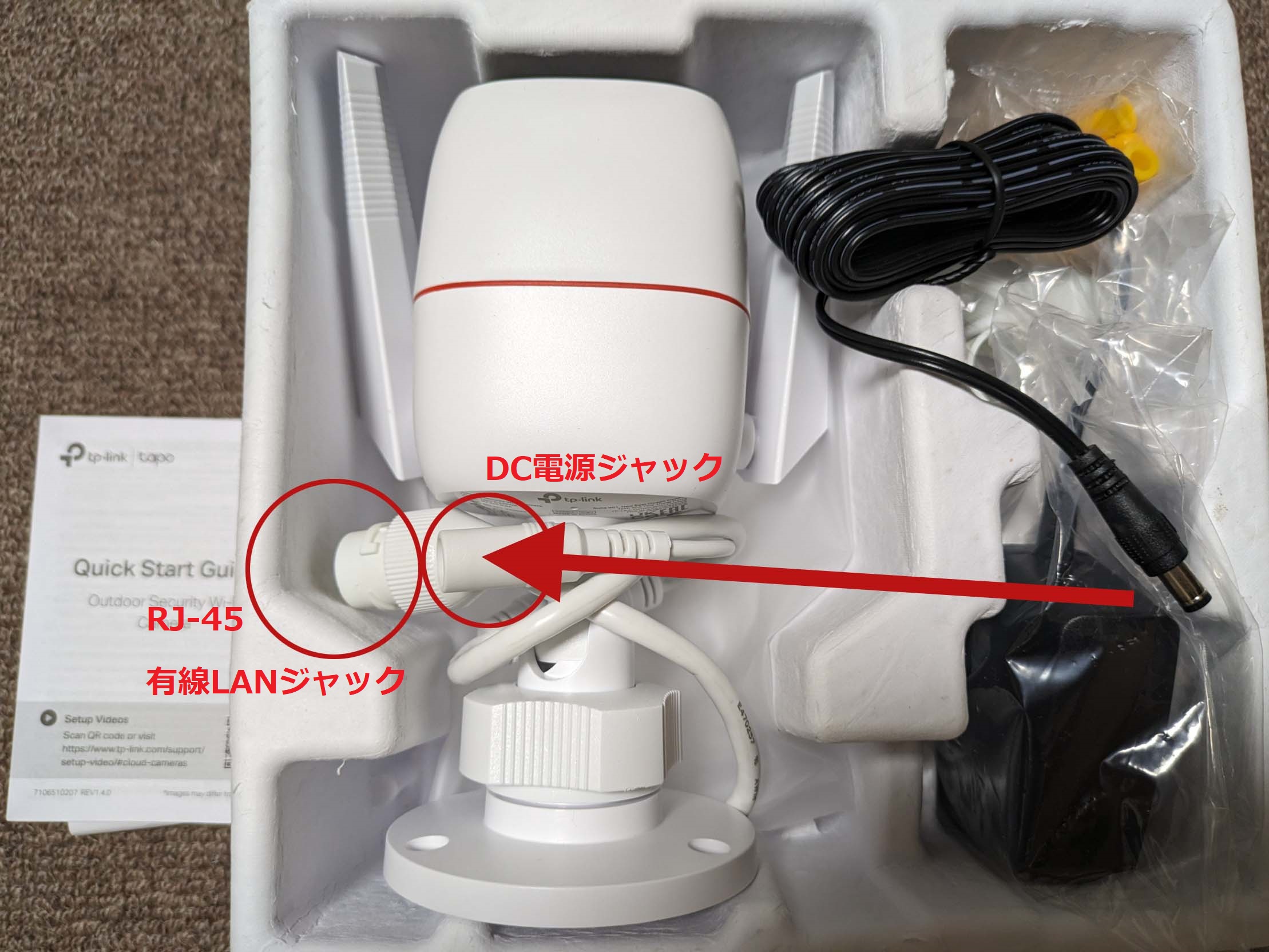 カメラ本体から延びているケーブルは2本。一方が電源のDCケーブル、もう一方が前述のRJ-45ジャック。昨今ではWi-Fi利用がほとんどだと思われるため、屋外設置を考えるとRJ-45ジャックの開口部が大きく目立つと感じる。「どう処理すればいいだろうか?」というのが悩みどころになった。取りあえずはブチルゴムテープを詰めて巻いて塞ぐことにしたが、Wi-Fi利用の場合は思い切って有線LAN対応側ケーブルを途中で切ってしまい、テーピングした方が良いかもしれない。