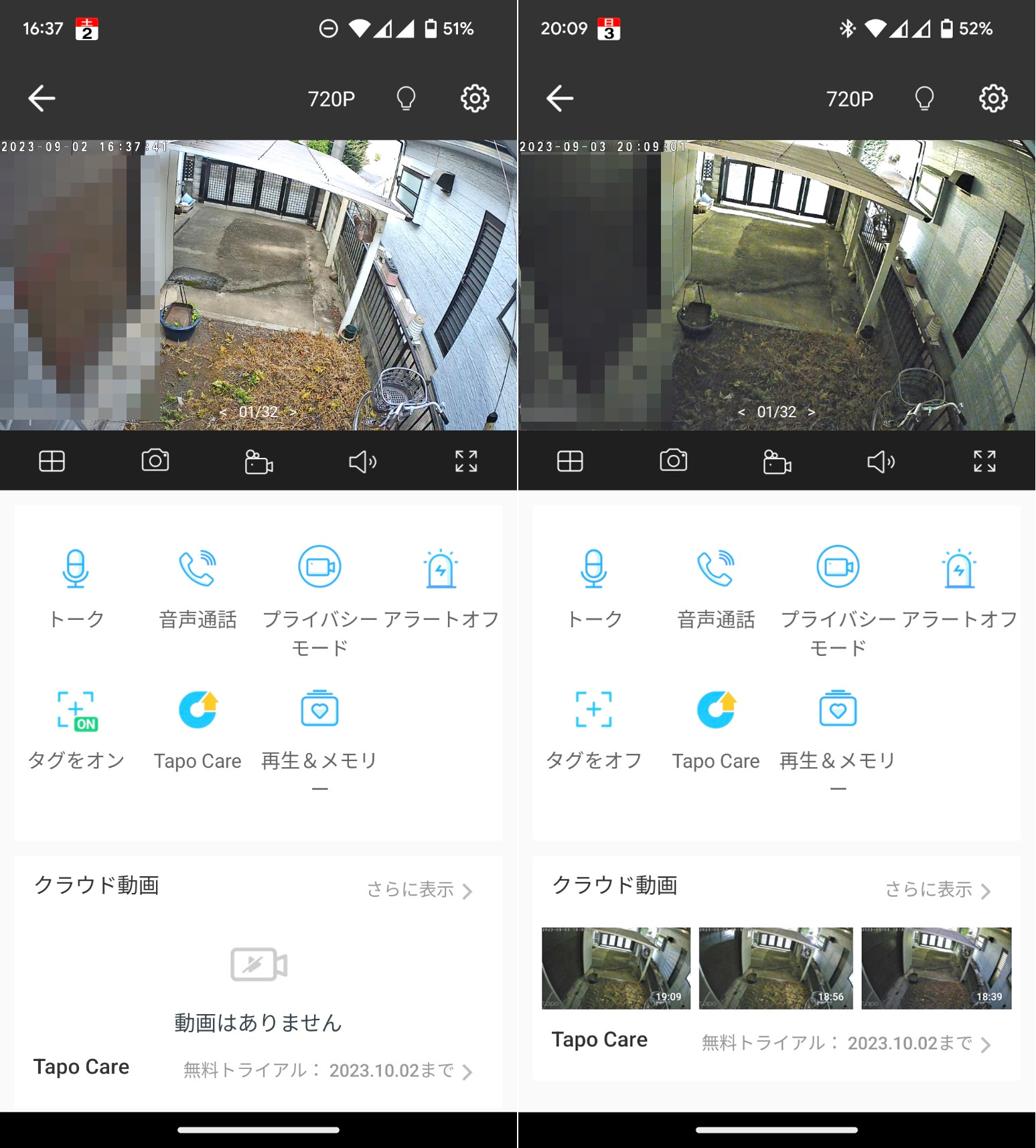 本体にはmicroSDが内蔵できるとのことだけれど、なるべく屋外使用を考えれば故障懸念要素を増やしたくない。できれば監視映像はネット越しに保存・確認したいところ。これまで屋内監視で使用してきた「Tapo C200」では、既にその該当サービス「Tapo Care」を使用していたものの、カメラ2台目になると倍の課金になる。400円/台。まぁ、監視カメラの保険と考えれば妥当なところかな。30日の試用期間が過ぎたら2台目も加えようかと思う。