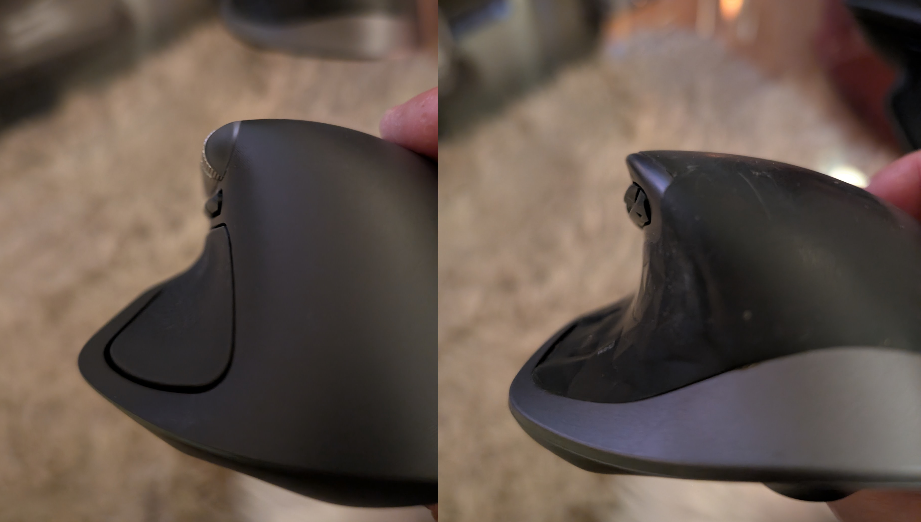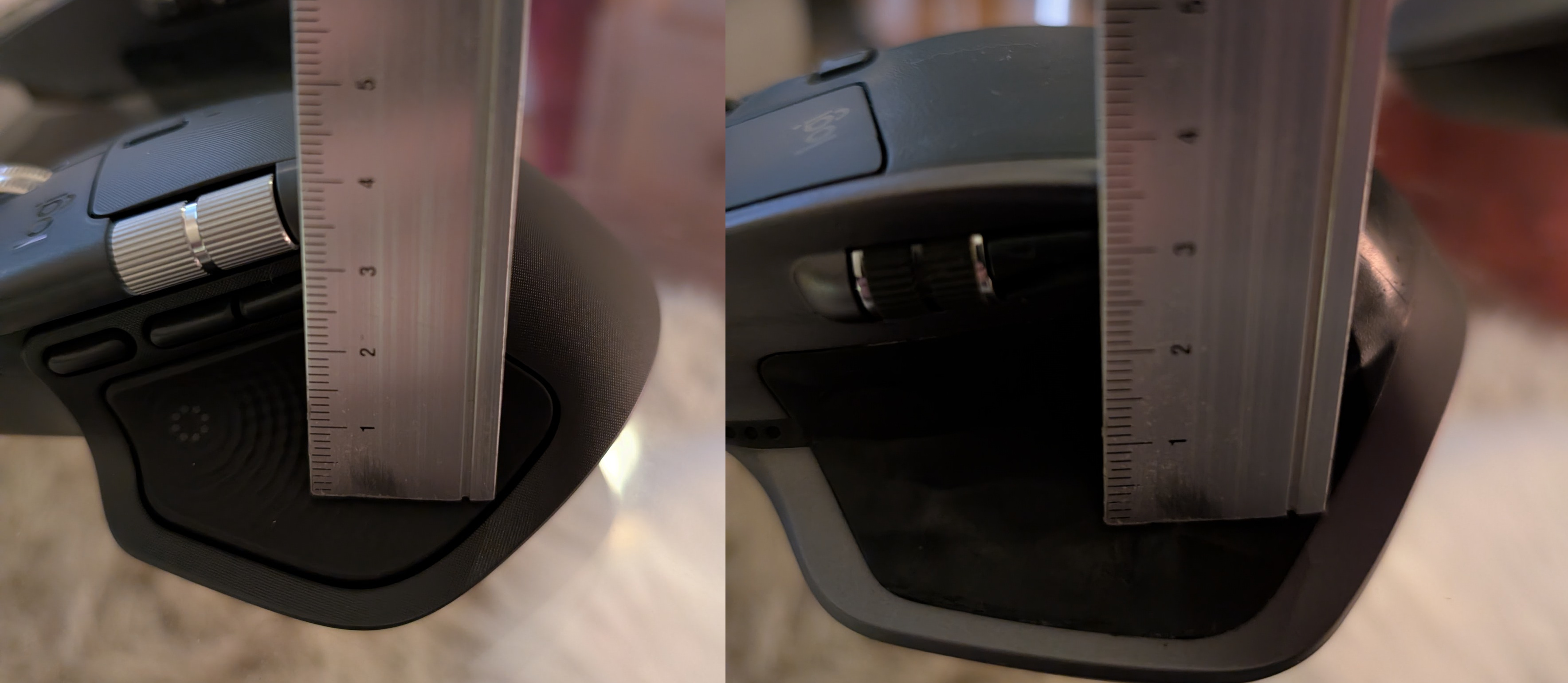結果的には…、下写真のようにMaster 2S(写真右)のボタンがせり出している感覚はMX Master 4でも再現されずイマイチ感は残ったまま。